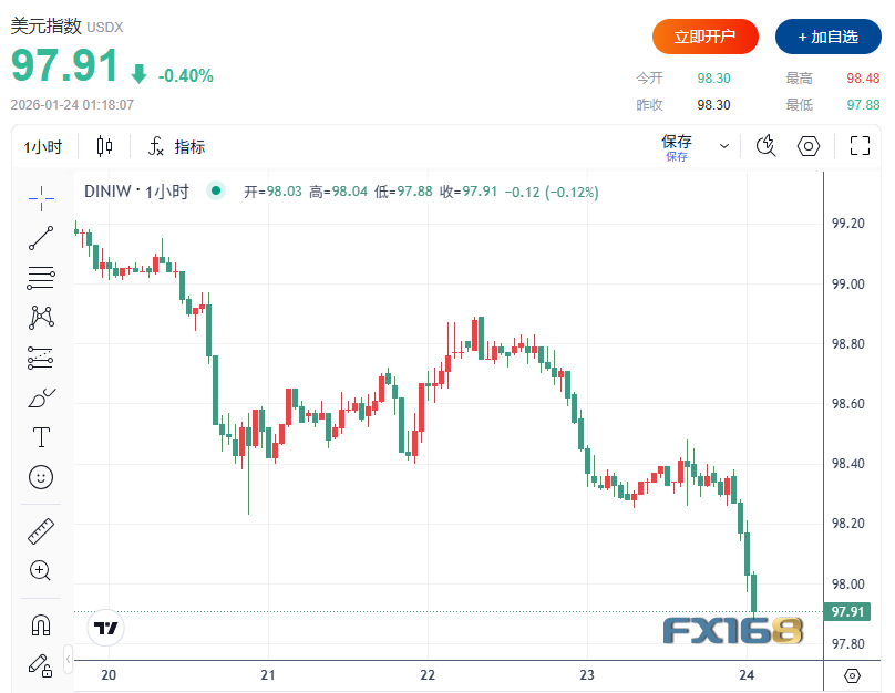 美市盘中,美元指数DXY失守98关口,为去年12月30日以来首次,日内跌幅0.30%。