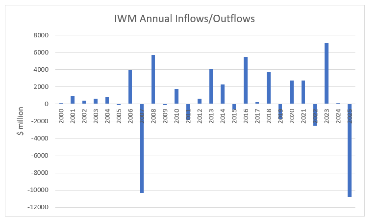 2025 年 Russell 2000 涨了 40%多,但美股小盘股 ETF 全年净流出了近 200 亿美元。这和过去的牛市形成鲜明对比——以前指数涨的时候,资金是跟着进去的。