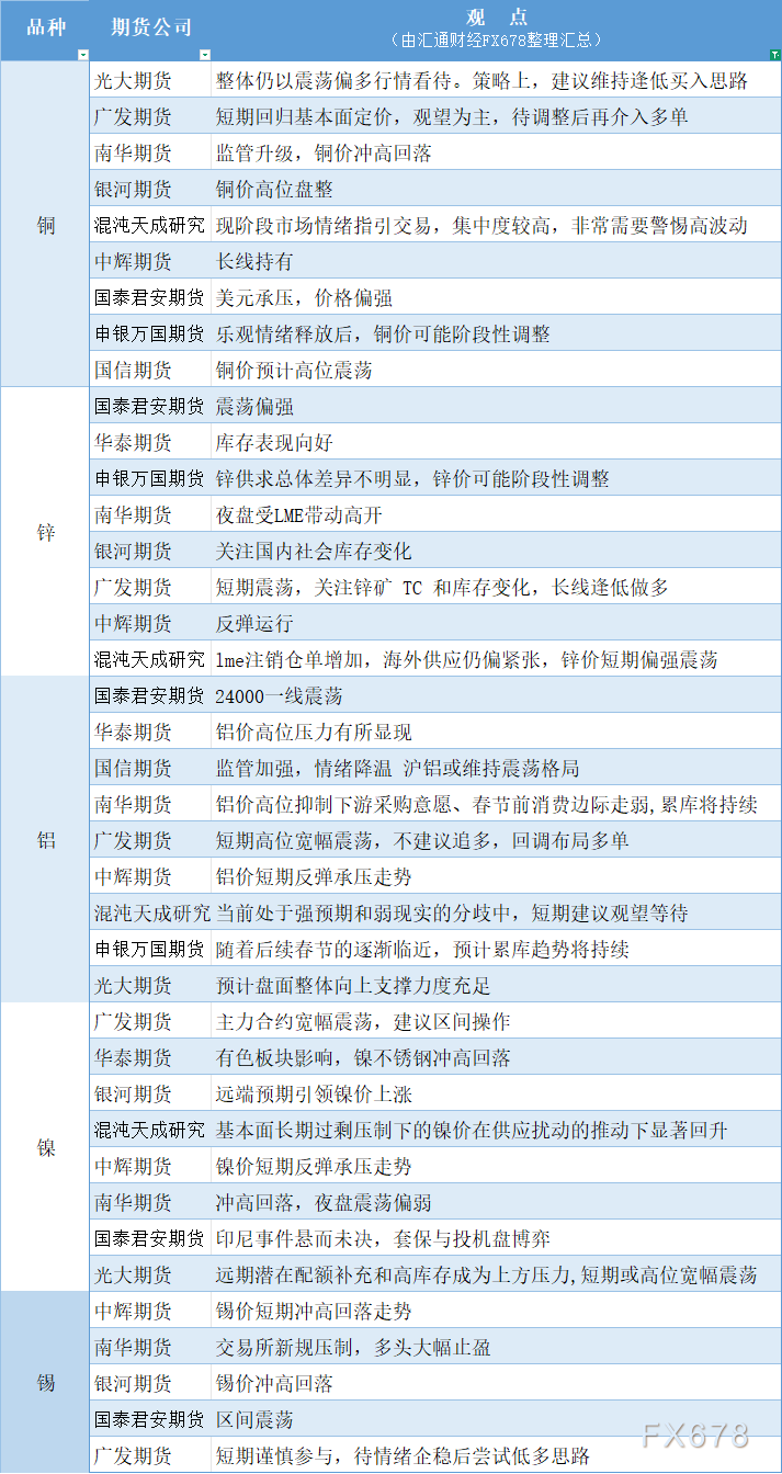期货公司观点汇总一张图:1月27日有色系(铜、锌、铝、镍、锡等)