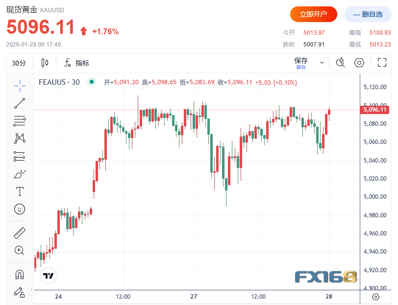 FX168财经报社(北美)讯 周二(1月27日),国际金价在前一交易日历史性突破5000美元/盎司关口后延续升势。经济与地缘政治不确定性挥之不去,推动投资者持续涌入黄金等避险资产。与此同时,市场正等待本周美联储利率决议及主席鲍威尔的表态,以研判美国利率路径与政策风险对贵金属的进一步影响。