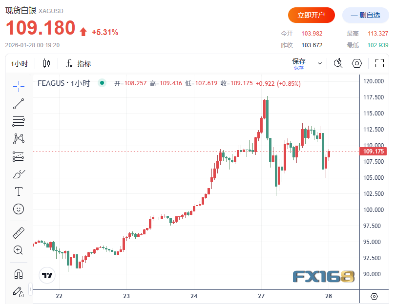 其他贵金属方面,现货白银周二大涨5.3%,交投于109.180美元一线;白银周一曾触及纪录高位117.69美元,今年以来涨幅已超过50%,此前一年涨幅达到146%。Widmer指出,白银后市波动可能明显加大,存在快速回撤风险,但强劲基本面与ETF资金流入或支撑其进一步上行,并提及潜在的更高目标区间。花旗则将白银短期目标价从100美元上调至150美元。与此同时,现货铂金下跌4.5%至2632.87美元,前一交易日曾创下2918.80美元的历史高位;钯金下跌2.4%至1935美元。