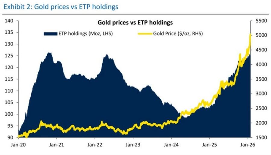 其次,宏观环境依然对黄金高度有利。RBC指出,贸易紧张局势、政治与地缘政治不稳定,以及围绕美联储独立性的担忧,是推动金价的主要催化因素。更为关键的是,该行并未观察到来自央行或投资者的需求出现回落迹象,交易所交易产品(ETP)的持仓规模正随着金价上涨而同步增加。