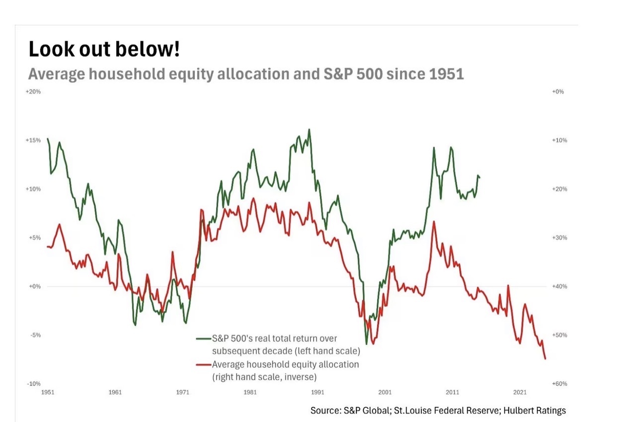 更高的股票配置比例代表悲观信号。图展示了标准普尔500在接下来10年的实际总回报(左侧坐标轴),以及美国家庭平均股票配置比例(右侧坐标轴,数值倒置)之间的关系。