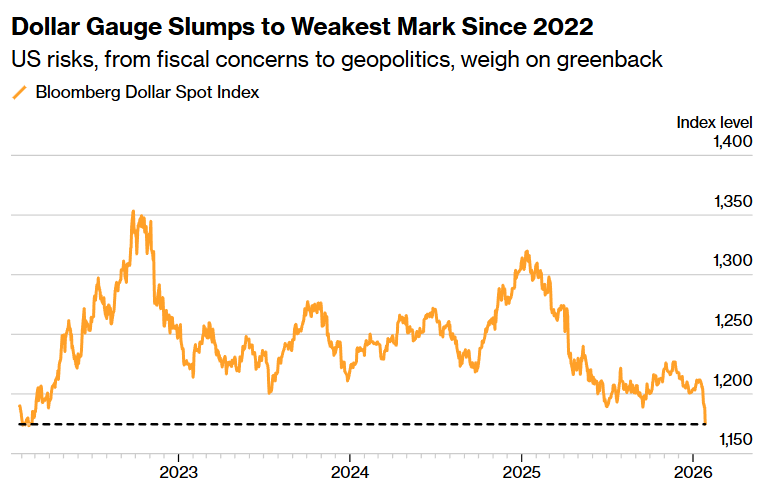 在特朗普周二(1月27日)表示他并不认为美元“贬值过度”之后,美元遭遇自去年关税推出以来最深的一次单日下跌。美元指数一度下挫高达1.2%。这些言论削弱了美元与美债的吸引力,推动了所谓的“贬值交易”。