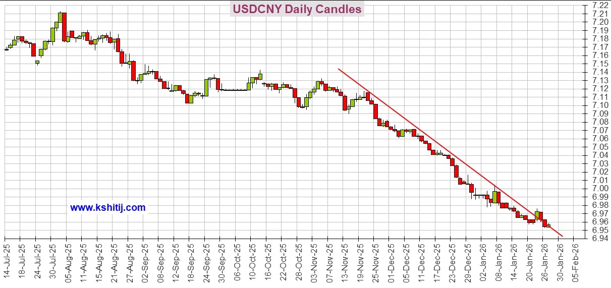 美元/人民币已跌破6.95,如果持续,跌势可能进一步延伸向6.90或更低。