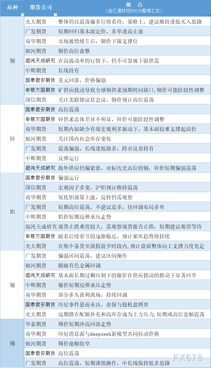 期货公司观点汇总一张图:1月28日有色系(铜、锌、铝、镍、锡等)。更多详见本文的汇通财经特制图。