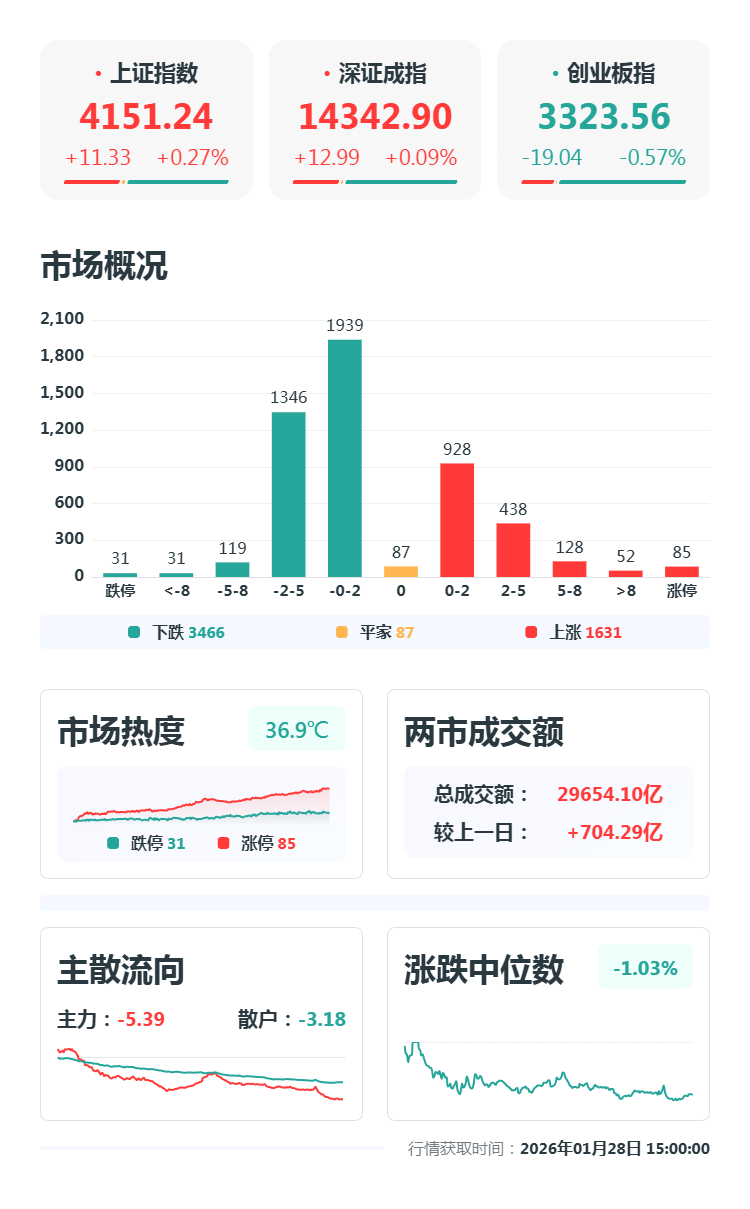 28日A股三大股指走势不一,沪指、深成指冲高回落,创业板指高开低走。截至收盘沪指涨0.27%,报4151.24点,深成指涨0.09%,报14342.89点,创业板指跌0.57%,报3323.56点,科创50指数跌0.08%,报1554.8点。沪深京三市成交额29923亿元,较上日放量708亿元,个股跌多涨少,沪深京三市近3700股飘绿,今日成交2.99万亿。