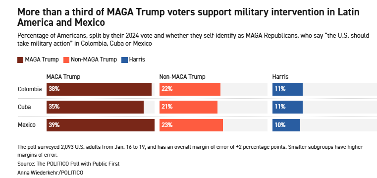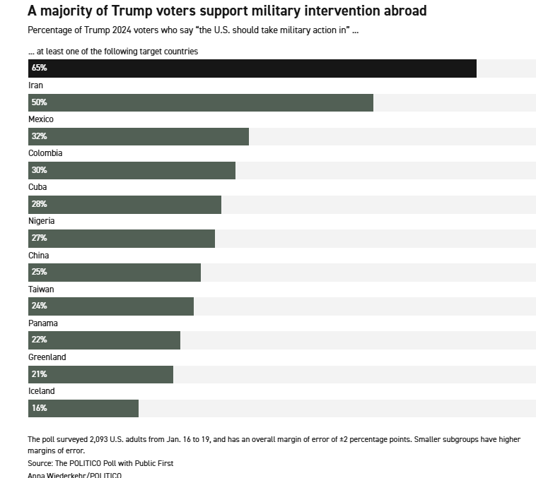 POLITICO与总部位于伦敦的独立民调机构Public First联合进行的最新民调显示,65%的特朗普选民,支持美国对至少一个潜在目标国家采取军事行动,包括伊朗、格陵兰(丹麦)、古巴、哥伦比亚、中国和墨西哥。