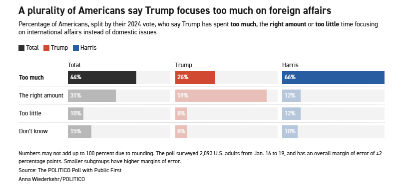 但在2024年投票支持特朗普的选民中,59%认为他在国际问题上投入的时间恰到好处,只有26%担心他过于关注海外事务。