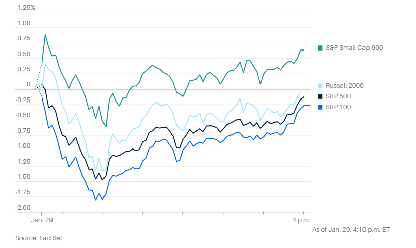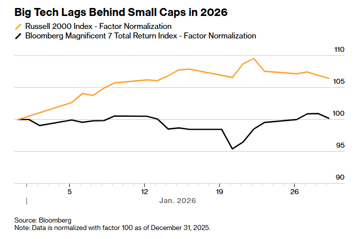 Ameriprise的安东尼·萨格利姆贝内指出,年初时投资者显得更愿意重新调整投资组合,至少部分地从人工智能相关交易中转向更贴近“实体”经济的资产类别、行业与公司,“除非‘华丽七雄’的财报大幅重设盈利预期(我们认为不太可能),投资者对小盘股和非科技周期股的早期偏好可能会持续。”