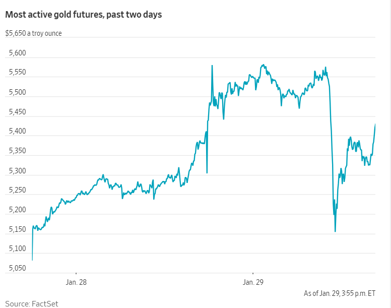 贵金属期货当日收高,此前盘中一度短暂下跌。 金价大幅波动,此前一度接近每盎司5600美元,上涨6.1%,之后又一度下跌超过3.3%。近期交割的黄金期货上涨0.3%,收于每金衡盎司5318.40美元,再创历史新高。白银也回升,收涨0.8%,至每盎司114.037美元,为白银历史上第二高的收盘价。
