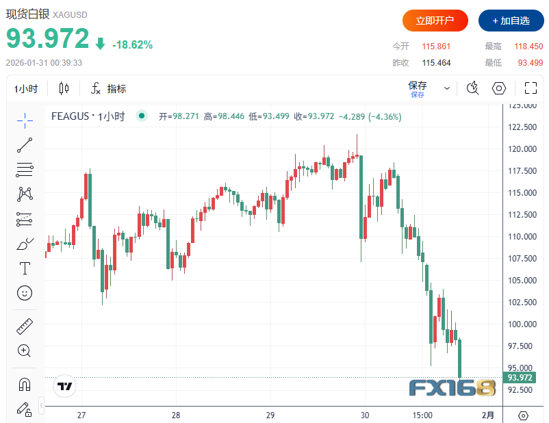 截至撰稿,现货白银大幅下跌约19%,至93.499美元/盎司低点。