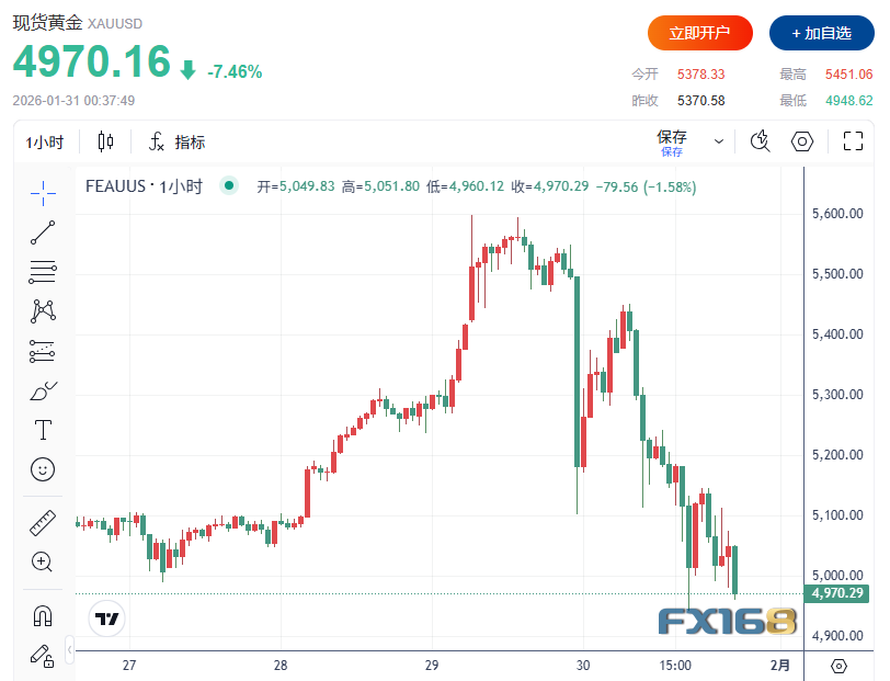 现货黄金下跌超7.5%,至4948.62美元/盎司。