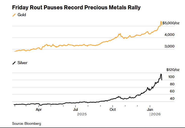 尽管黄金和白银本月仍涨幅可观,但周五的暴跌是自去年10月以来对本轮涨势最猛烈的一次冲击,主要是因为特朗普提名凯文·沃什担任美联储主席后美元反弹引发的。
