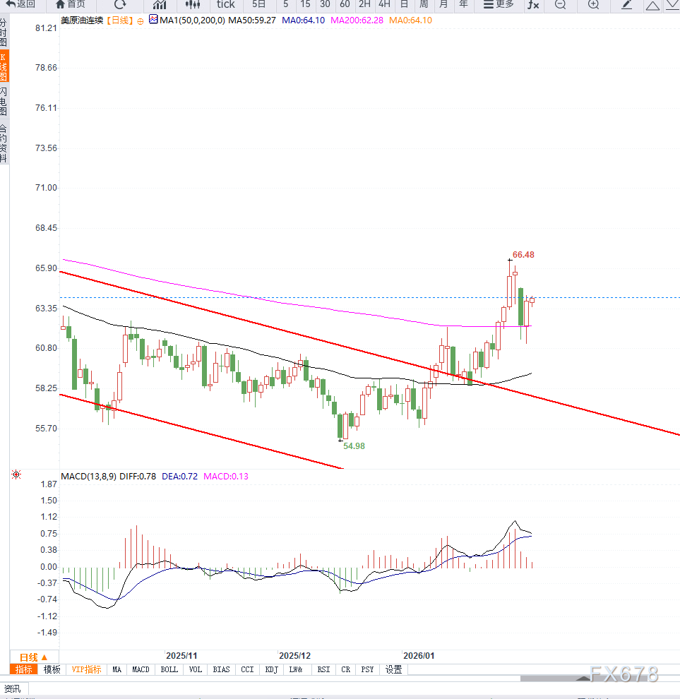 从历史表现看,该均线在多次调整中发挥了承接作用,若后续价格能够持续守住该区域,日线级别的中期结构仍有望维持稳定。反之,一旦有效跌破并收于50日均线下方,油价可能重新回测61美元甚至更低水平。