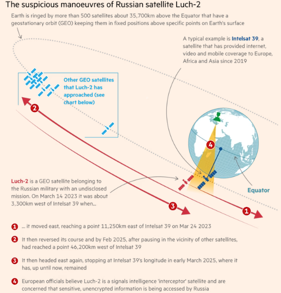 西方的军事和民用航天机构多年来一直在追踪“卢奇-1号”和“卢奇-2号”这两颗俄罗斯太空器,这两者在轨道上多次执行可疑机动,曾多次危险地靠近欧洲最关键的静止轨道卫星。这些卫星高悬地球上空,服务于欧洲,包括英国,以及非洲和中东的大部分地区。