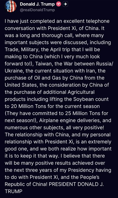 特朗普在社交媒体发文称,他与习近平讨论了伊朗相关问题,并就美中关系中的多项重要议题展开交流,内容包括贸易、台湾问题,以及他计划于4月访问北京的安排。