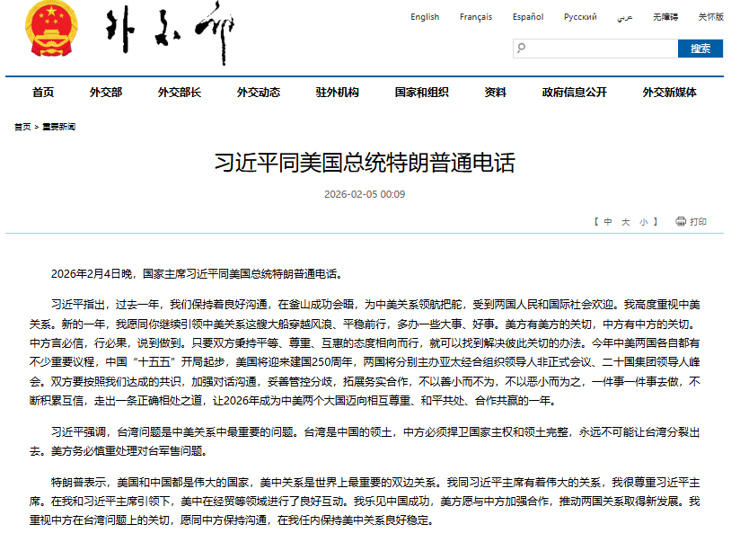 FX168财经报社(北美)讯 美国总统特朗普周三(2月4日)表示,他当天与中国国家主席习近平进行了“广泛而深入”的通话,双方就伊朗局势以及美中关系中的一系列关键议题交换了看法。此番通话正值美国政府试图推动包括中国在内的国家进一步孤立伊朗之际。