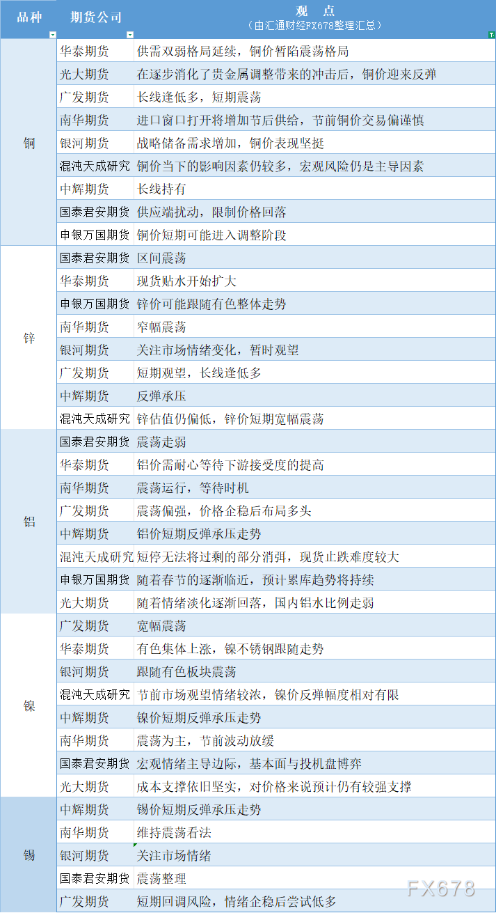 汇通财经APP讯—— 期货公司观点汇总一张图:2月5日有色系(铜、锌、铝、镍、锡等)。更多详见本文的汇通财经特制图。