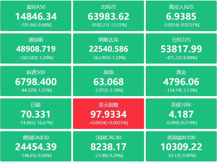 期货:现货黄金跌4.0%报4763.2美元,纽约黄金期货跌3.0%报4793美元;白银期货跌15.5%报71.12美元,现货白银跌18.5%报71.67美元;原油期货跌1.85美元,跌幅2.84%报63.29美元;布伦特原油报67.55美元;天然气期货报3.5090美元,汽油期货报1.9266美元,取暖油期货报2.3932美元。