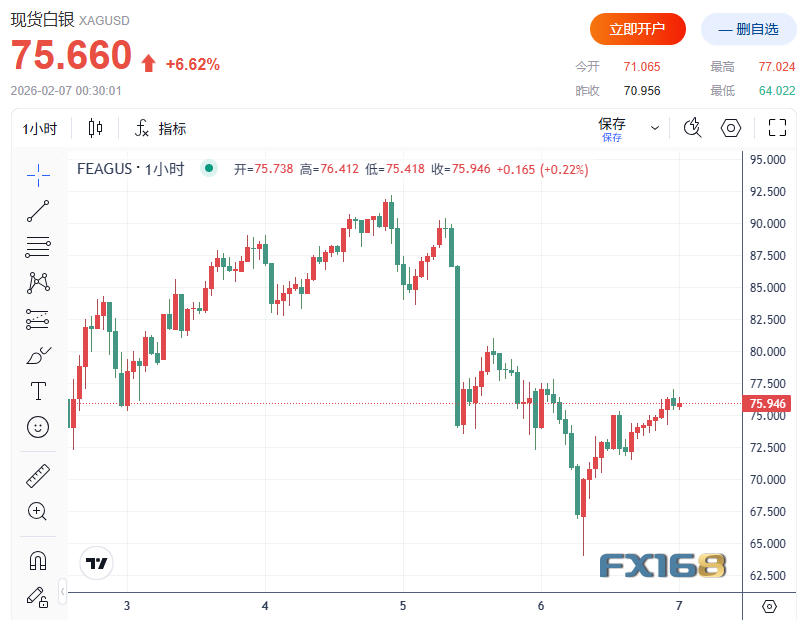 FX168财经报社(北美)讯 白银周五(2月6日)延续极端波动行情:在流动性偏薄、抛压集中释放的背景下,银价盘中一度下挫近10%并逼近64美元/盎司,随后快速反弹转涨。与此同时,芝商所(CME)再度上调保证金要求,进一步挤压杠杆交易者操作空间,令市场在反弹中仍面临“被动去杠杆”引发的二次踩踏风险。