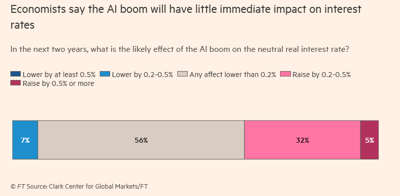 约三分之一受访者认为,AI热潮反而可能略微推高所谓的中性利率(即既不刺激也不抑制经济需求的利率水平)。