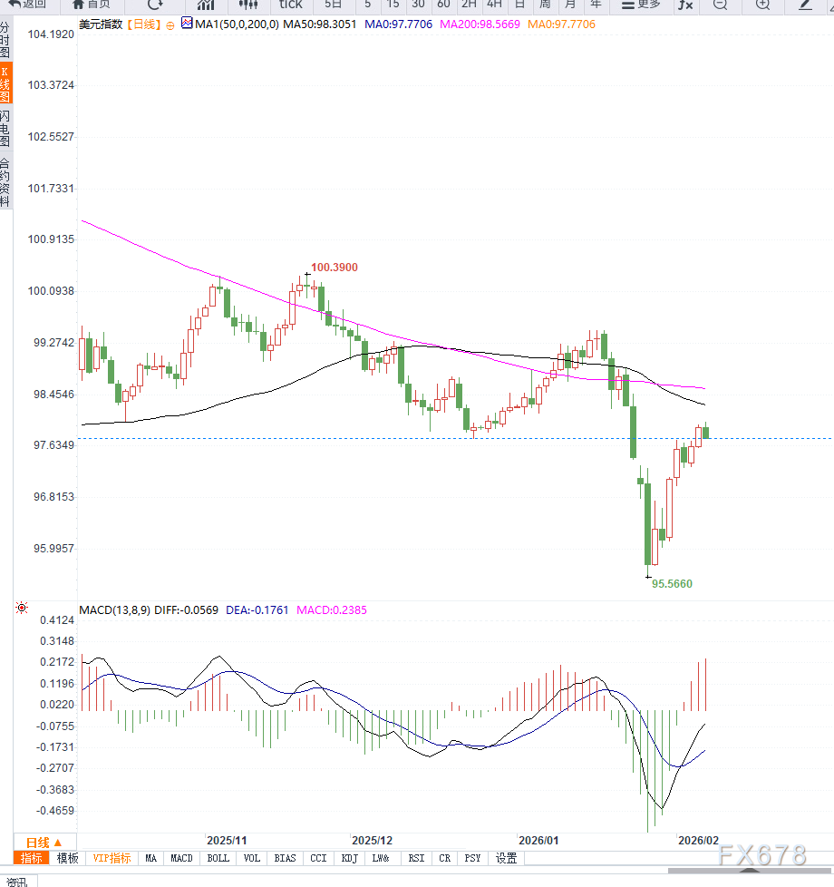 从日线结构来看, 美元指数在连续反弹后进入高位整理阶段,整体仍维持在短期上升通道内运行。当前价格围绕97.90附近震荡,上方98.30—98.50区域构成阶段性重要阻力,该位置对应前期高点密集区,若无法有效突破, 美元指数短期上行动能可能受限。