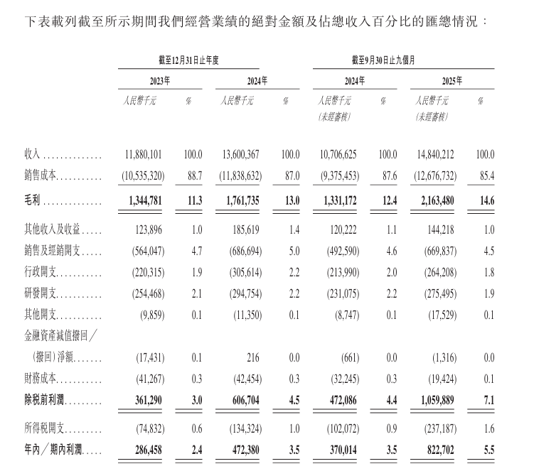 然而,高增速背后需冷静看待其盈利水平:即便在利润高点(2025年前九个月),其毛利率为14.6%,经营利润率(税前)为7.1%,净利率为5.5%。这组数据印证了其业务本质仍是低毛利率、高运营杠杆的制造业模式,利润极易受到原材料价格、行业价格竞争或销售费用攀升的侵蚀。