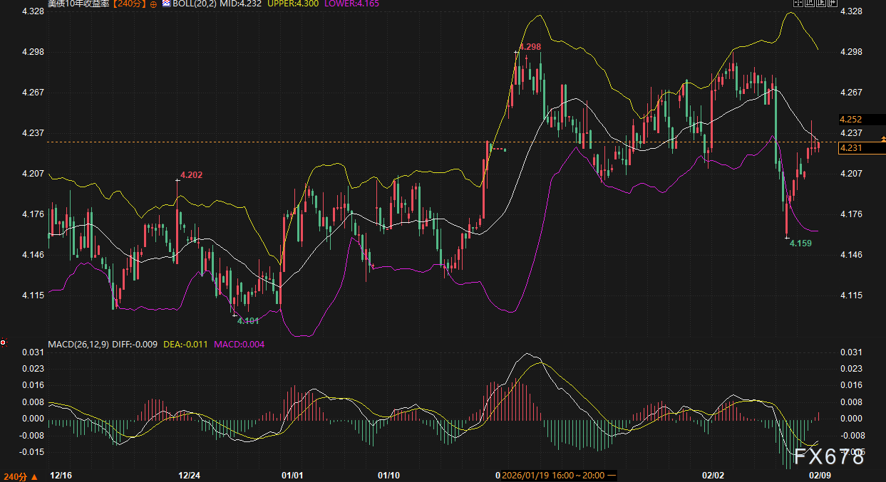 从纯粹的 技术分析视角观察,当前10年期美债收益率正处在一个关键的平衡节点。根据截至2月9日早盘的240分钟图数据,10年期收益率暂报4.229%,日内小幅上涨。图表显示,其价格正围绕布林带(参数20,2)中轨4.232%附近进行争夺。目前布林带上轨位于4.300%,下轨位于4.165%,通道呈现收窄态势,通常预示着波动率收缩和即将到来的方向性选择。