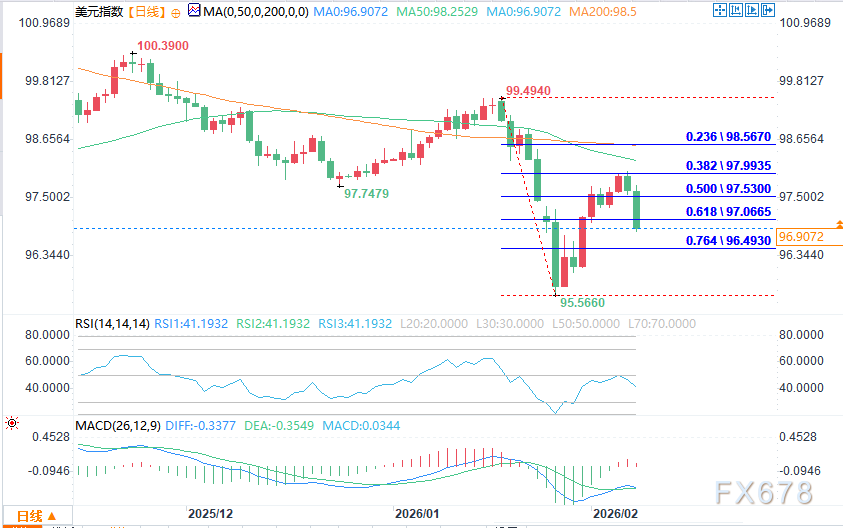 北京时间00:05, 美元指数报96.8786,位于50日均线(98.2523)与200日均线(98.5518)下方弱势运行。