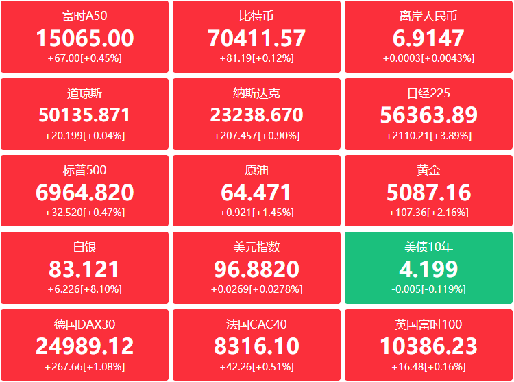 期货:现货黄金涨2.01%报5064.10美元,黄金期货涨2.04%报5081.50美元;现货白银涨6.98%报83.2699美元,白银期货涨7.67%报82.795美元;铜期货涨1.31%报5.9590美元;现货铂金涨1.34%,现货钯金涨1.93%。原油期货涨0.81美元,涨幅1.27%报64.36美元,布伦特原油期货涨0.99美元,涨幅1.45%报69.04美元;天然气期货报3.1380美元,汽油期货报1.9855美元,取暖油期货报2.4169美元。