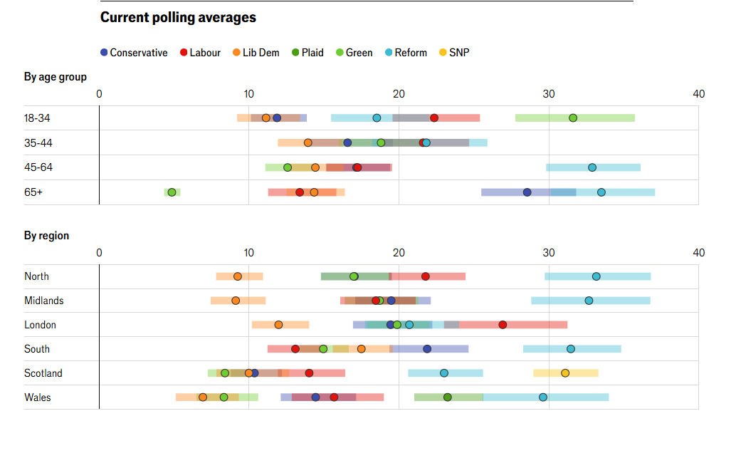 在相对新任党魁扎克·波兰斯基的领导下,绿党的崛起在很大程度上要归功于年轻选民的支持。与此同时,改革党则是45岁以上人群中最受欢迎的政党,其中包括原本最忠于保守党的退休选民。