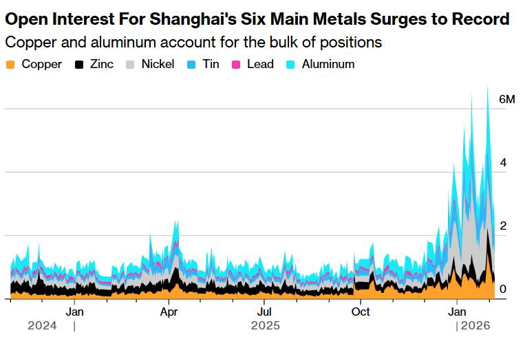 (上海六大金属期货持仓量飙升至纪录高位 来源:上海期货交易所)
