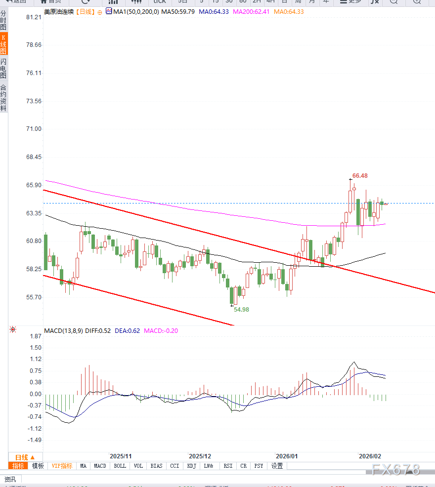 从日线图结构观察,WTI原油当前处于阶段性整理区间。此前连续反弹后,价格在64美元附近出现明显滞涨迹象,动能指标逐步趋于平缓,显示多头力量有所减弱。