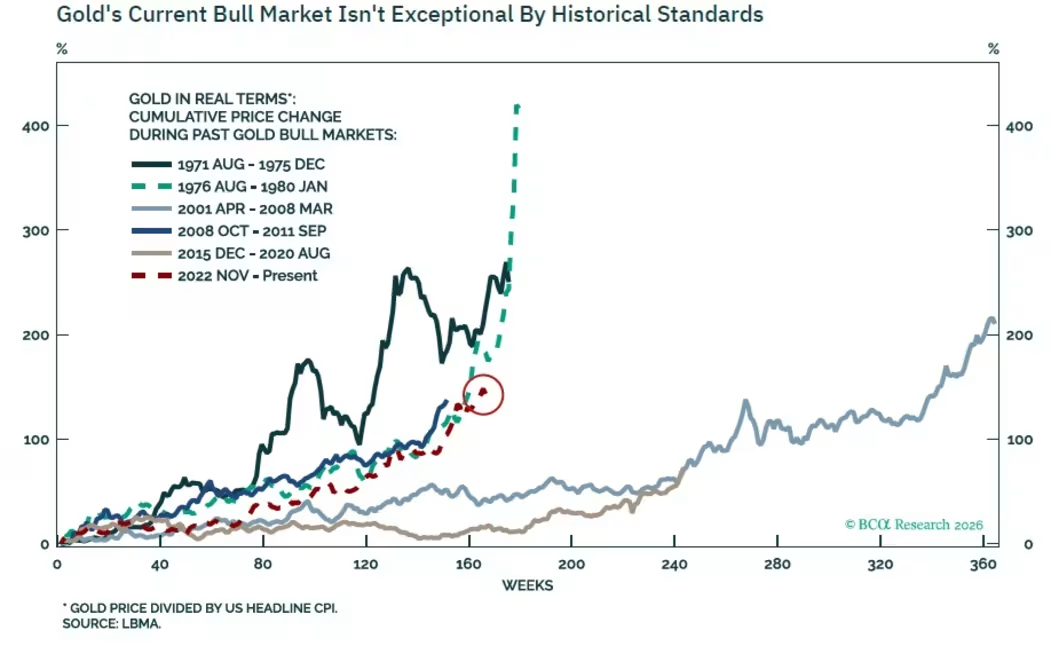 因此,如果黄金确实处于BCA Research所认为的“长期(结构性)牛市”之中,那么最近的回撤与以往长期上涨行情的典型表现是一致的。