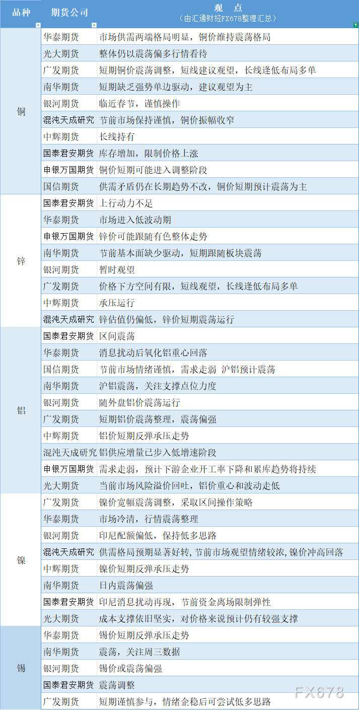 期货公司观点汇总一张图:2月11日有色系(铜、锌、铝、镍、锡等)。更多详见本文的汇通财经特制图。
