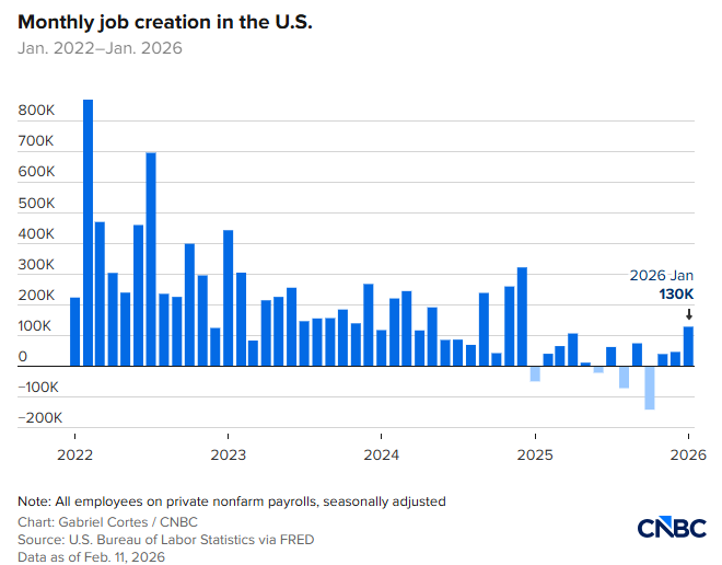 FX168财经报社(北美)讯 2026年开局美国就业增长强于预期,缓解市场对劳动力市场走弱的担忧。美国劳工统计局(BLS)周三(2月11日)公布的数据显示,1月非农就业新增13万人、显著高于预期,失业率小幅回落,消息公布后市场走强。