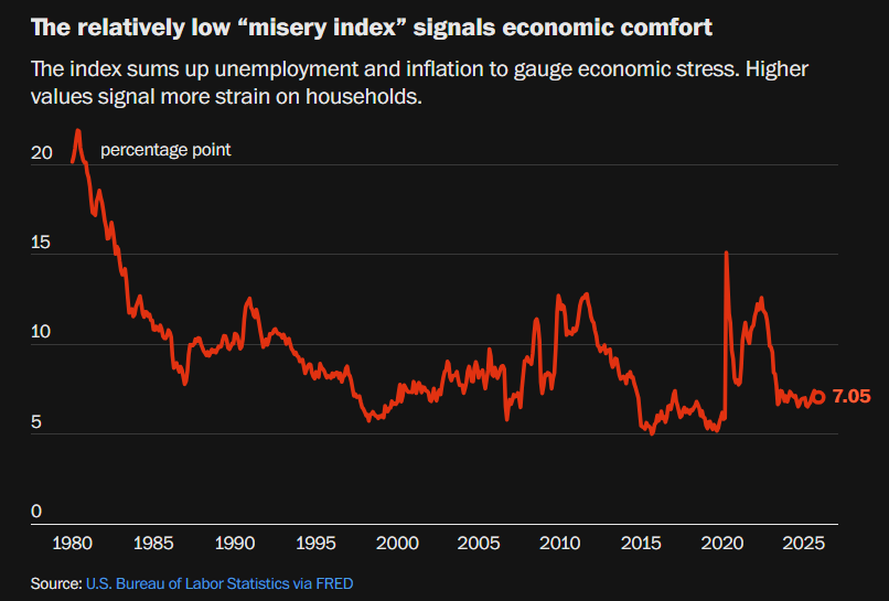 乍一看,这种不满似乎与经济数据不成比例。衡量经济痛苦感的“痛苦指数”(失业率与通胀率之和),如今低于整个1980年代以及1990年代的大部分时间。