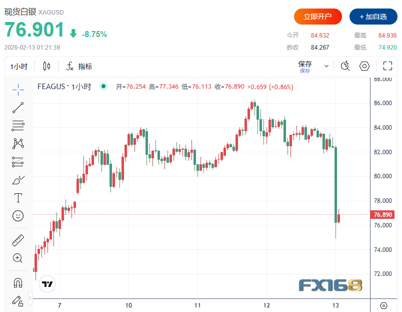 现货白银日内重挫8美元,触及74.92美元/盎司跌幅,跌幅约达10%。