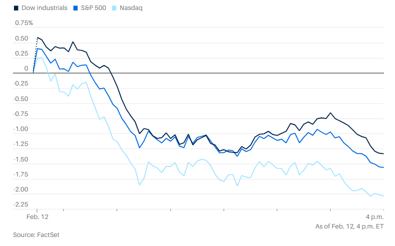 对人工智能担忧再度影响市场,加上大宗商品疲软,美股周四全线下跌,波及多个资产类别。黄金和白银大幅下挫,交易者将资金转入被视为避险资产的美国国债,比特币的抛售也进一步加剧。纳斯达克综合指数下跌2%。标普500指数下跌1.6%。道琼斯工业平均指数下跌663点,跌幅1.3%。