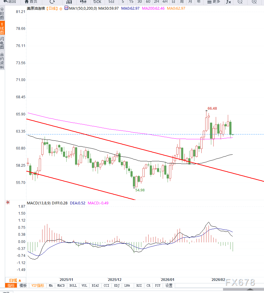 从日线结构观察,WTI 原油 期货近期在63美元下方运行,显示短线趋势开始转弱。此前的震荡上行结构已被打破,价格跌破前期上升通道下沿,市场节奏由趋势行情转向区间震荡。
