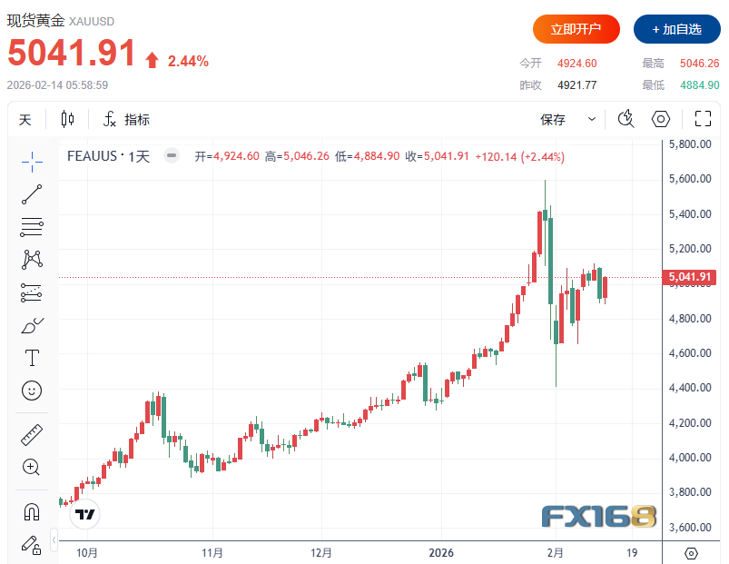 不过,黄金随后迅速展开反弹。到周五(2月13日)美股开盘前,金价已重新站上5000美元关口,并最终收于5000美元上方约40美元的位置,重新回到本周早些时候的整理区间。