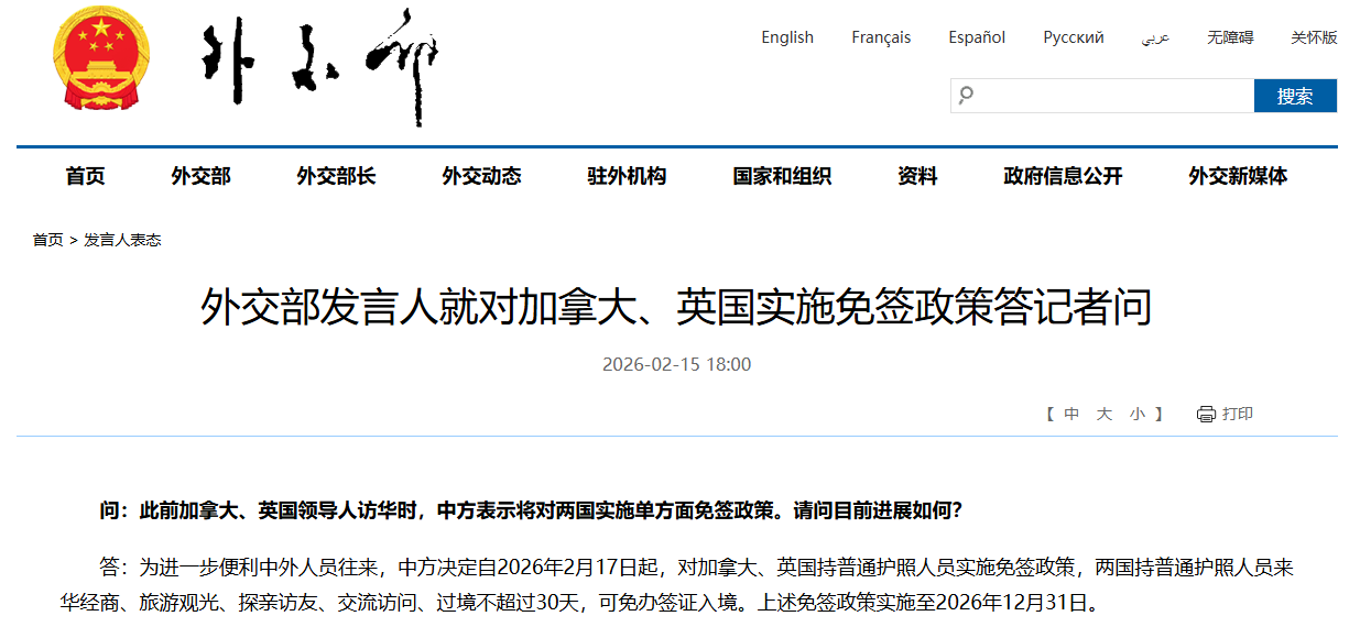 FX168财经报社(北美)讯 中国对加拿大、英国公民赴华入境便利再度“加码”。中国外交部最新表示,自2026年2月17日起,对加拿大、英国持普通护照人员实施免签政策,两国人员来华经商、旅游观光、探亲访友、交流访问、过境等,停留不超过30天可免办签证入境;该政策将实施至2026年12月31日。
