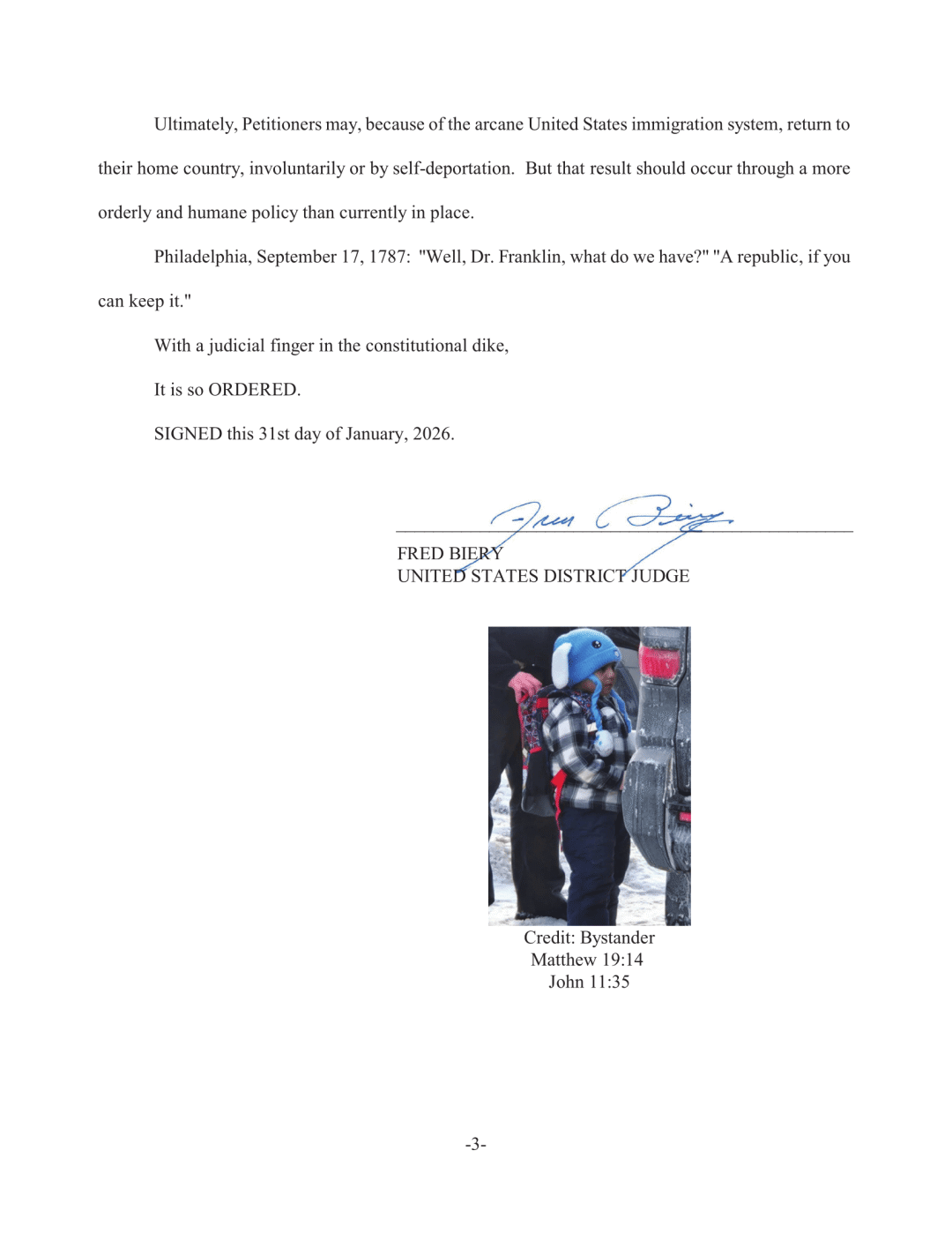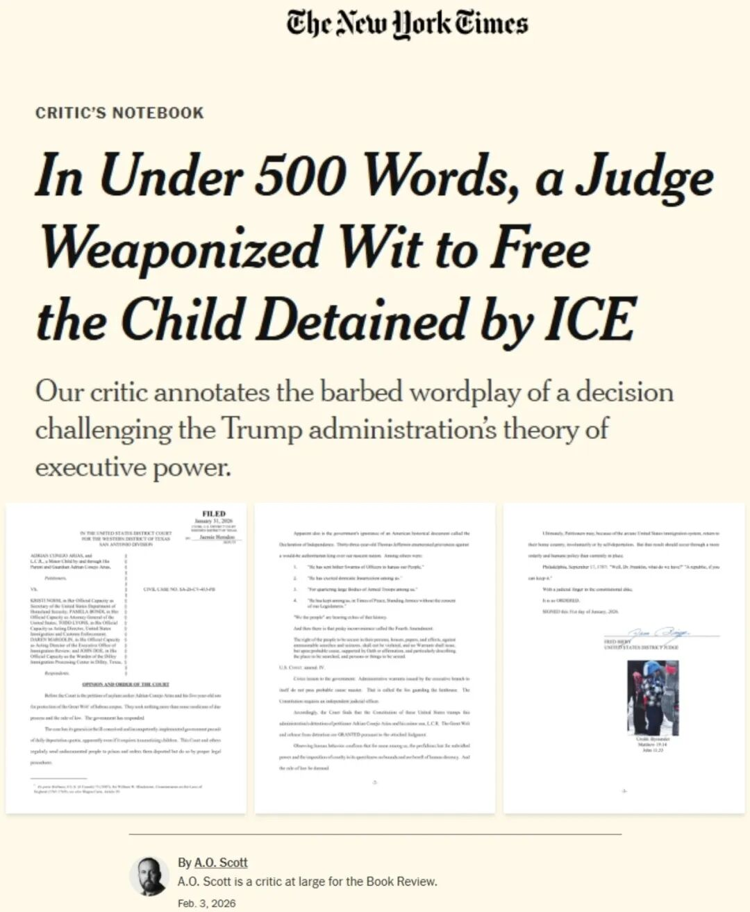 2026年1月,在一份广泛流传备受好评的意见书中,美国德克萨斯州西区联邦法官弗雷德·比里(Fred Biery)比里法官,阻止了对五岁男孩利亚姆·科内霍·拉莫斯(Liam Conejo Ramos)的遣返,下令释放这名男孩及其父亲。