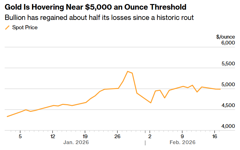 (金价徘徊在5,000美元关口附近 来源:彭博)