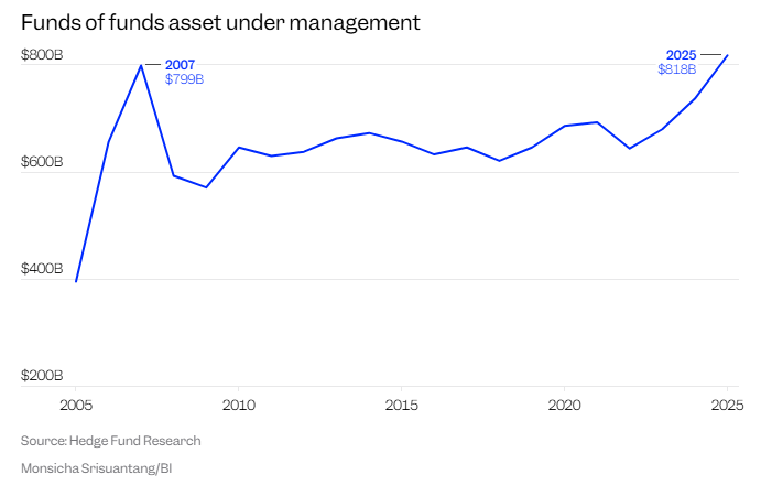 根据Hedge Fund Research(HFR)的数据,截至2025年底,基金中的基金管理资产规模已达到8180亿美元。这是这家长期行业追踪机构记录以来的最高水平,也是该行业首次超过2007年底创下的7990亿美元历史高位。