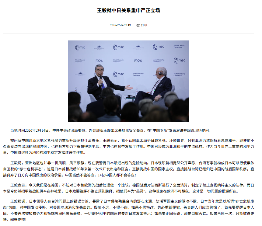 王毅周一在慕尼黑安全会议上表示:“首先要提醒日本人民,不要再次被极右势力和极端思潮所蒙蔽裹胁。一切爱好和平的国家也要对日本发出警示:如果要走回头路,那是自取灭亡。如果再赌一次,只能败得更快,输得更惨!”