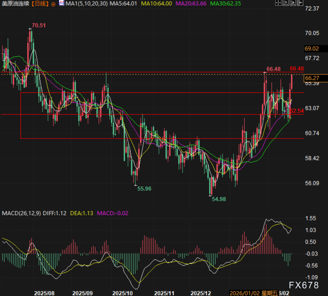 期货在上个交易日涨超5%的情况下续涨2%,有望创出阶段新高,目前交投于66.36左右。