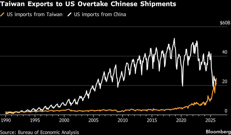 FX168财经报社(北美)讯 受美国总统特朗普关税政策重塑贸易流以及全球人工智能(AI)热潮推高科技产品需求的双重影响,美国从台湾地区的进口额在数十年来首次超过了中国大陆。