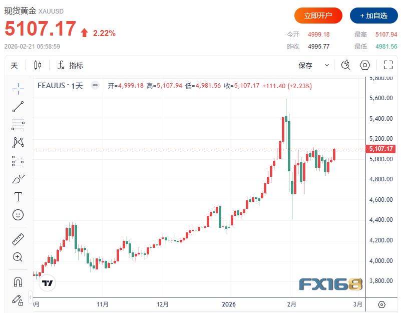 周五(2月20日)美市尾盘,现货黄金收报5107.17美元/盎司,日内大涨111.40美元,涨幅达2.23%。本周,金价上涨65.26美元,涨幅为1.29%。